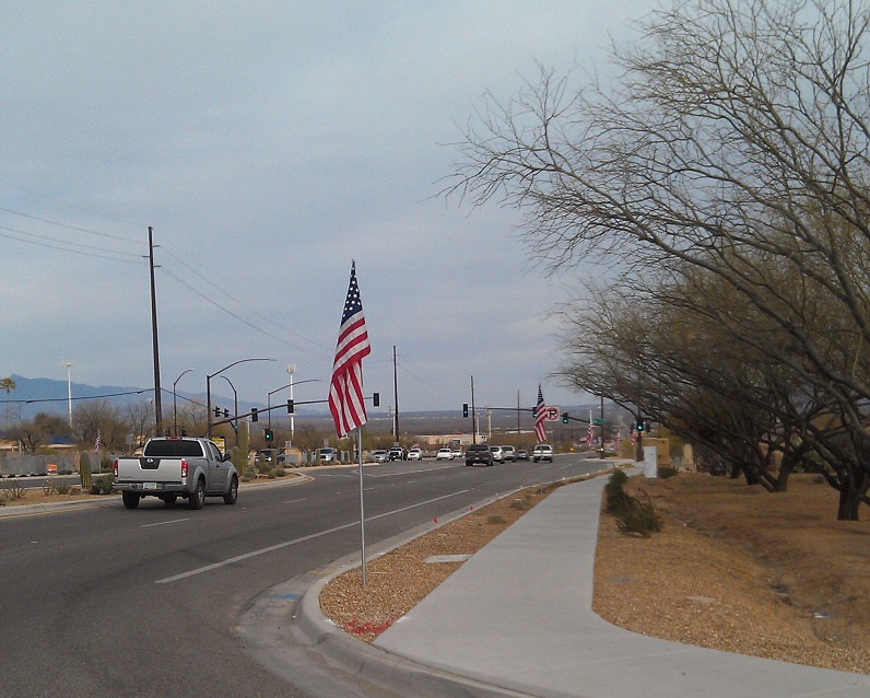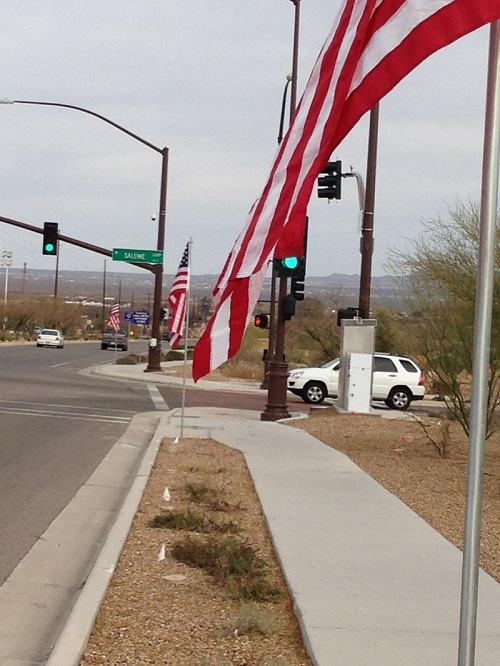 The flags, which are placed along Sahuarita Road from Town Hall to in front of the Rancho Sahuarita Marketplace, help Sahuarita to launch a tradition that takes place in other cities, including in Green Valley. The Rotary Club saw the opportunity to create an “Avenue of Flags” for Sahuarita as a “statement for national pride, patriotism, and culture. “ It is their hope that the tradition will carry on in the community for years to come.